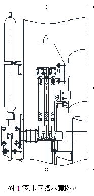 圖1所示為液壓缸與蓄能器間的連接管路,為實(shí)現(xiàn)蓄能器對(duì)液壓缸快速補(bǔ)壓緩沖作用,A處設(shè)計(jì)較大直徑管道接口,圖1中A處的原密封形式詳見圖2。圖2中的分油管一端連接高壓膠管,另一端焊接法蘭1,法蘭1與液壓缸法蘭采用螺栓連接,兩法蘭是采用一道端面O型圈(圖2中密封處1)實(shí)現(xiàn)密封。